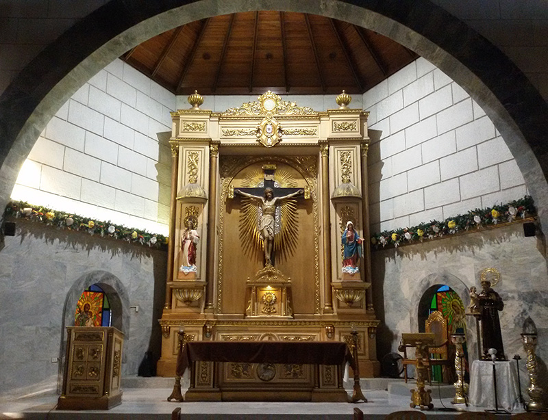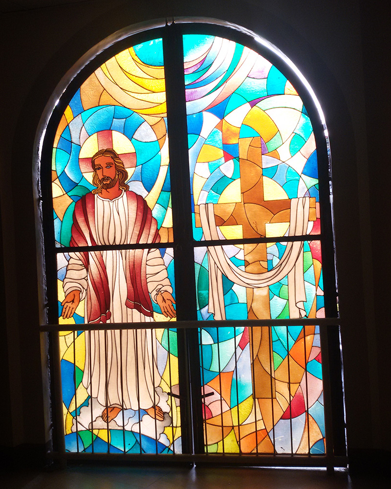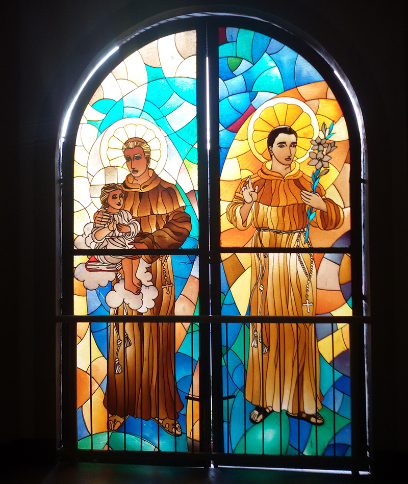 The sanctuary of San Antonio De Padua Parish has a simple rectangular goldtone reredos on the back center. It has a large recess on which the crucifix is mounted and framed by the protruding parts of the reredos. The crucifix has a black cross with goldtone rays emanating from its back. The statue of Jesus in the crucifix looks like he is stepping on top of the tabernacle. The tabernacle here is the goldtone box with a monstrance-like embossed decoration in front. The left and right parts of the frame have platforms attached to them; on the left, as seen from the nave is a smaller statue of Jesus in red and white, and on the right is a statue of Mary in white, blue, and red. The altar in front of the reredos also has goldtone color with curly decorations in front and is draped with brown cloth. The lectern is on the left as seen from the nave; it has similar colors and design to that of the altar. A smaller pedestal for reading is on the right, and on its back is the priest's chair. A statue of St. Anthony carrying baby Jesus is also visible here, on the right of the priest's chair. The wall at the back of the reredos is divided into upper and lower half sections, with a row of flowers and leaves between them. The upper half of the wall is white with a large brick pattern, while the lower half is gray with a cement-like surface.A semi-oblong stained glass pane as seen from inside the San Antonio De Padua Parish is divided vertically into two sections by a steel frame. The left half depicts St. Anthony of Padua holding baby Jesus on the shoulder with his right hand. He is wearing a brown sackcloth robe with a rope as a belt. Jesus is sitting on a mass of cloud hovering in front of St. Anthony. Part of the cloud also holds a red book. St. Anthony has a rosary attached to the left part of his belt. Jesus is wearing a white robe. The right half of the stained glass also depicts St. Anthony, with the same clothing as in the left half. Here, he is standing while holding a twig with white lilies.A statue depicting the resurrected Christ. He is raising his right hand to heaven, while his left hand is holding a cross-shaped staff. He is wearing a white robe that is held by his left shoulders, and the right part of his chest is exposed. He is standing on what looks like a cloud, with two angel heads at the bottom.A statue depicting Mary with crown made of stars carrying baby Jesus. Mary is wearing a white robe with beige cloak. Her left hand is holding baby Jesus, and her right arm is bent down forward. Her middle and ring fingers are curled, touching the thumb, while her pinky and index finger are stretched out. Jesus is wearing a white robe with brown lining at the ends. His arms are spread outward as if he is about to hug someone.A semi-oblong stained glass pane as seen from inside the San Antonio De Padua Parish is divided vertically into two sections by a steel frame. The left half depicts  Jesus in a white robe with a red coat. His arms are on the side of and almost parallel to his body, with the palm of his hands showing. The other half shows a brown cross with a white cloth draping on it.